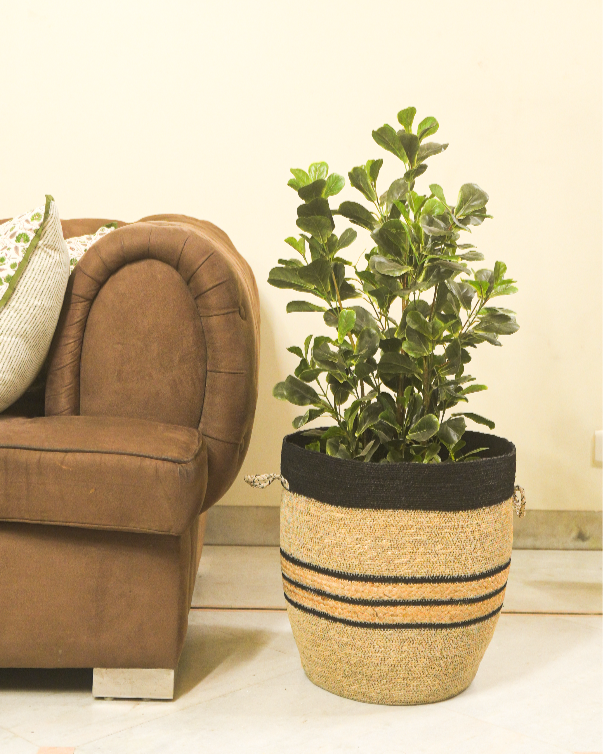 The Urban Weave Basket combines timeless craftsmanship with contemporary contrast. Handwoven from natural jute and seagrass, it features a structured cylindrical form with bold black accents — including a thick upper rim and three sleek horizontal stripes that wrap around the body. The integrated rope handles add functionality, making it easy to move around while storing everything from dry laundry to toys or throws. With its neutral palette and graphic design, it fits seamlessly into modern, rustic, or eco-conscious homes.